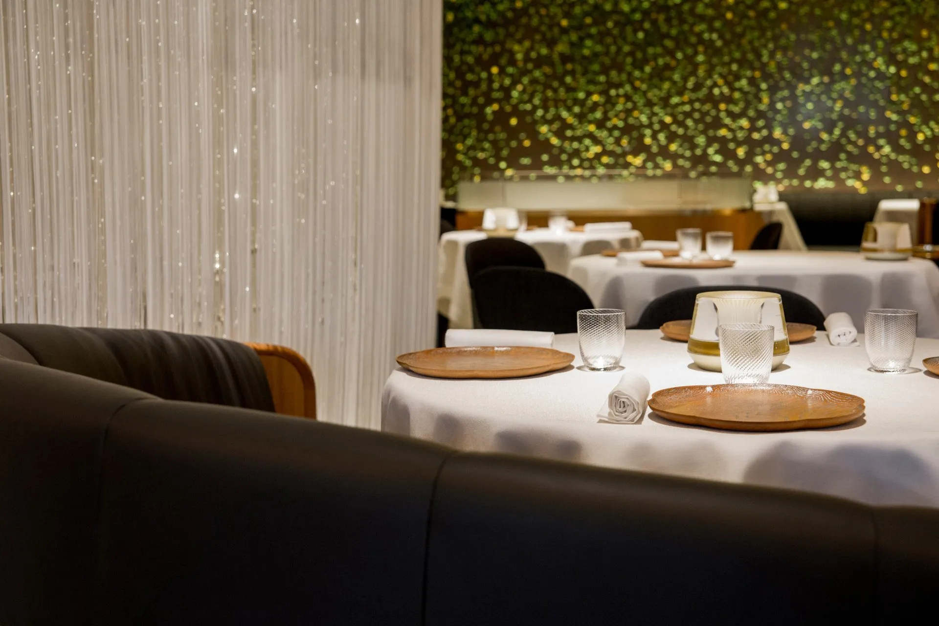Thousands of silk buttons in varying shades of green line the walls of Salon Privé, creating a soft, moss-like cocoon that mirrors the natural verdancy of nearby Hyde Park. A warm fireplace flickers at the far end of the room, welcoming you in for an exceptional dining experience.