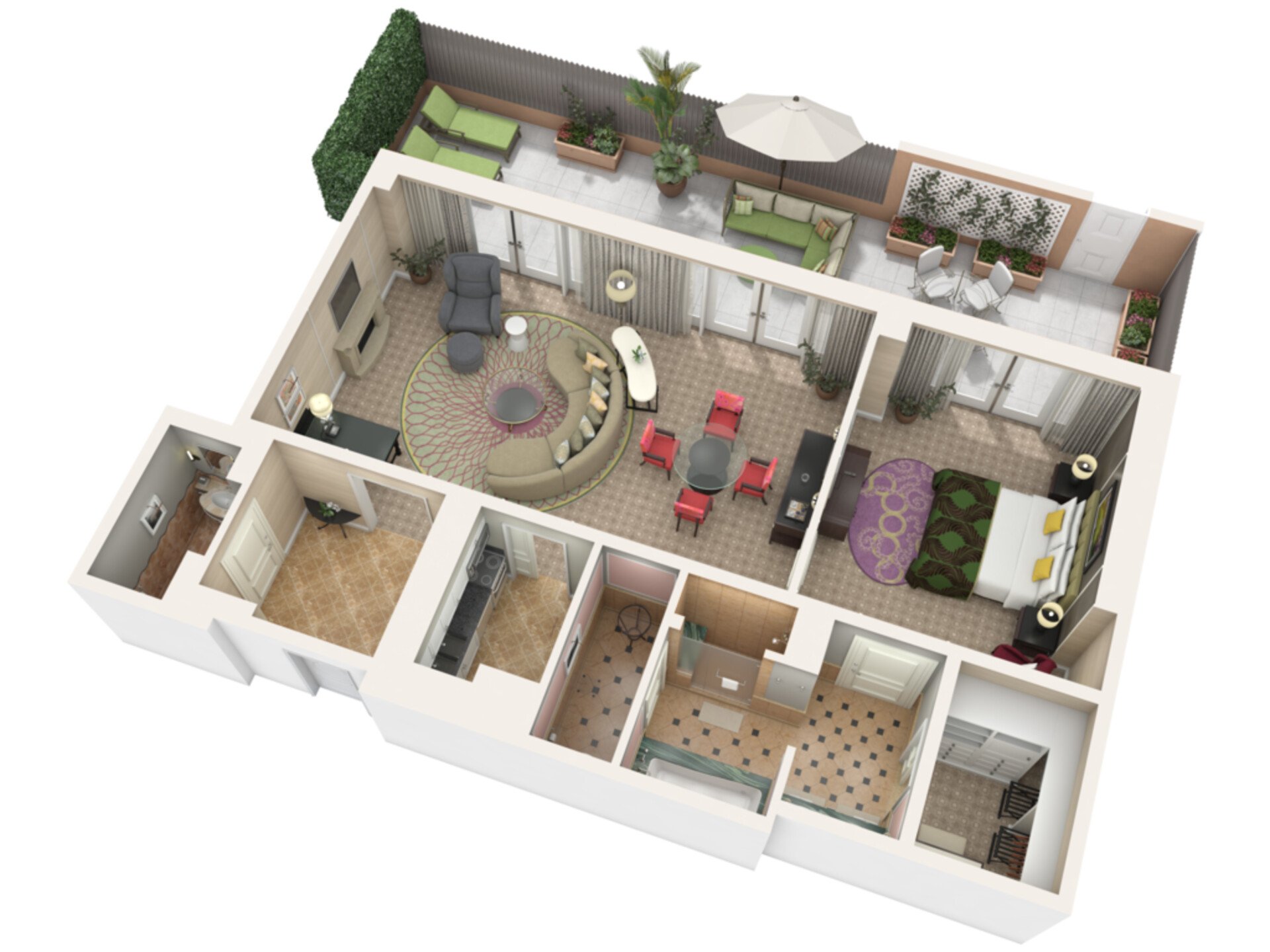A most glorious suite full of wonderful furnishings, stylish warmth and lashings of cool elegance. Your incredible bed and spacious patio will make it hard to leave.