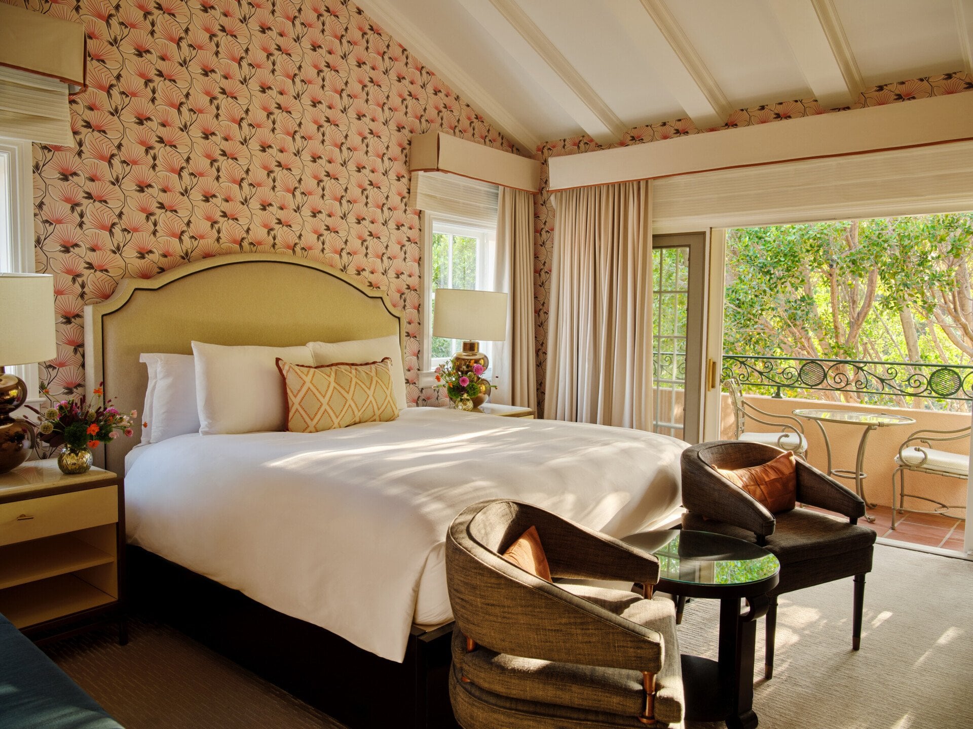 Renowned for our gloriously huge and comfortable beds, we take sleep seriously. The bespoke cotton linens are embroidered with The Beverly Hills Hotel logo and topped with a soft duvet.
