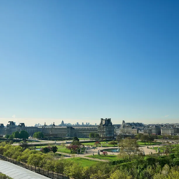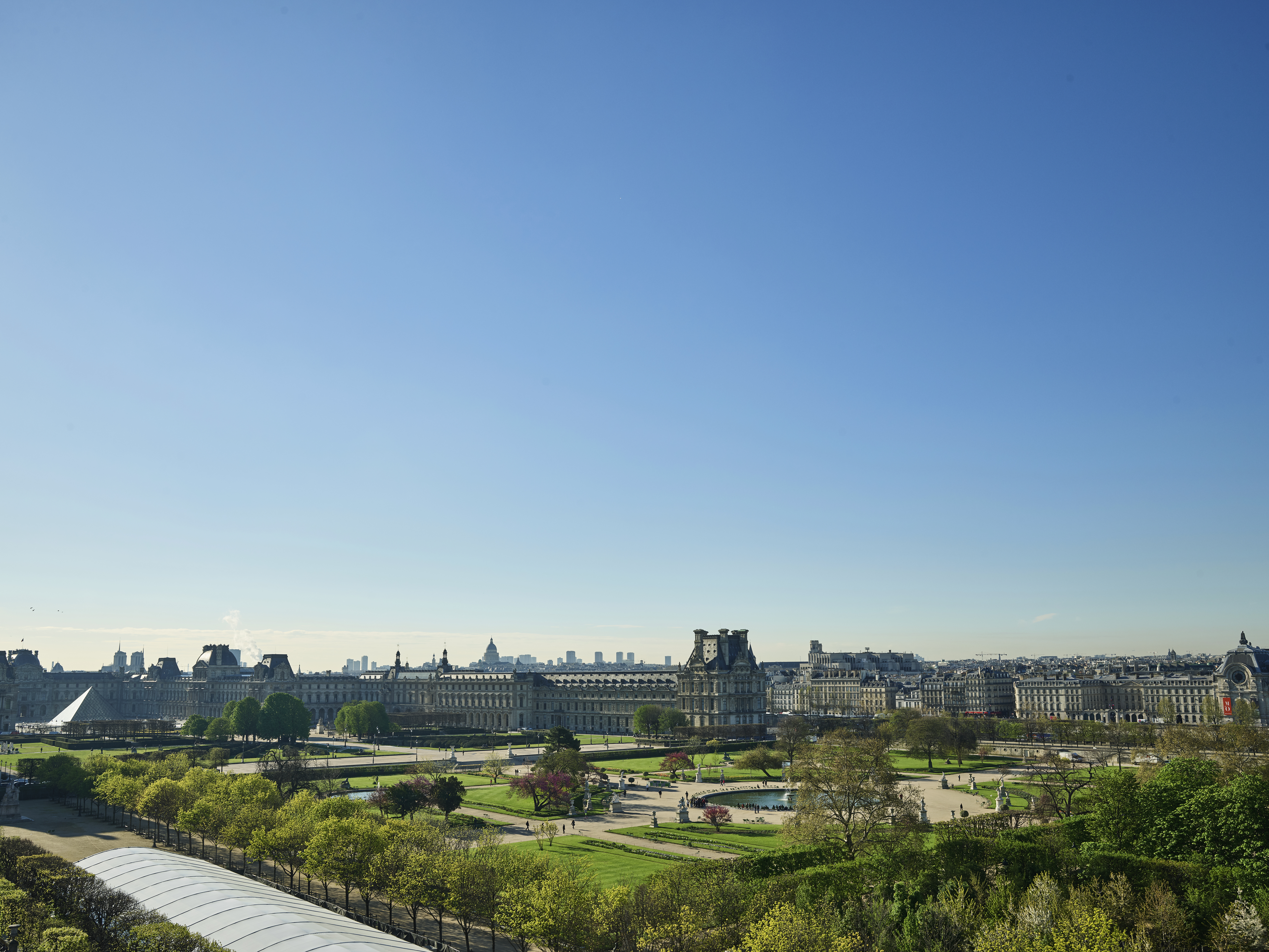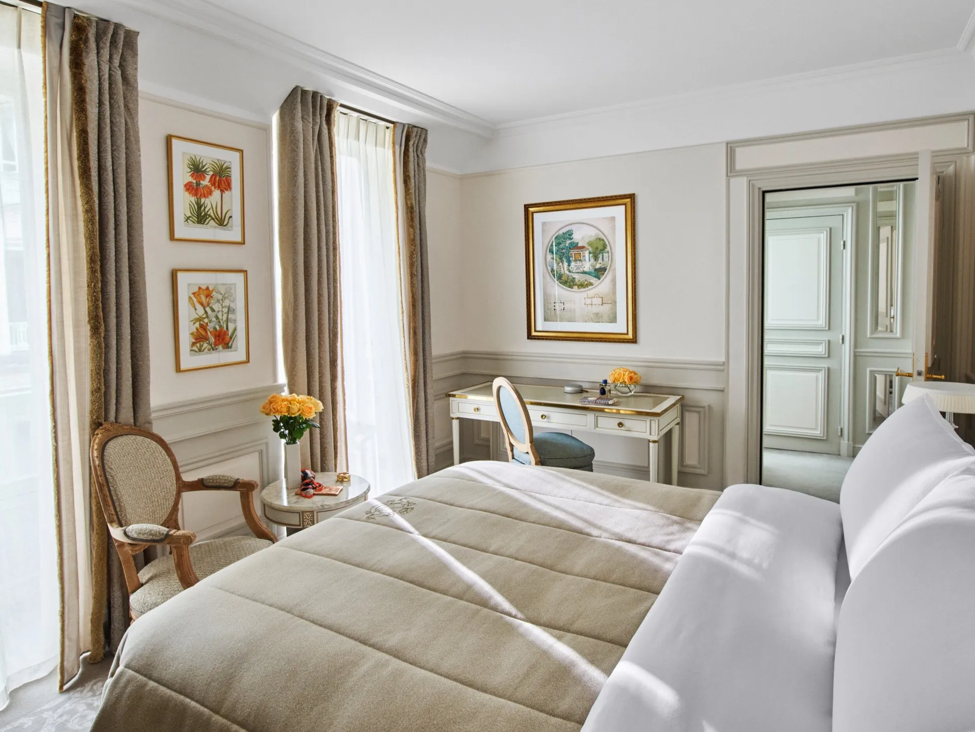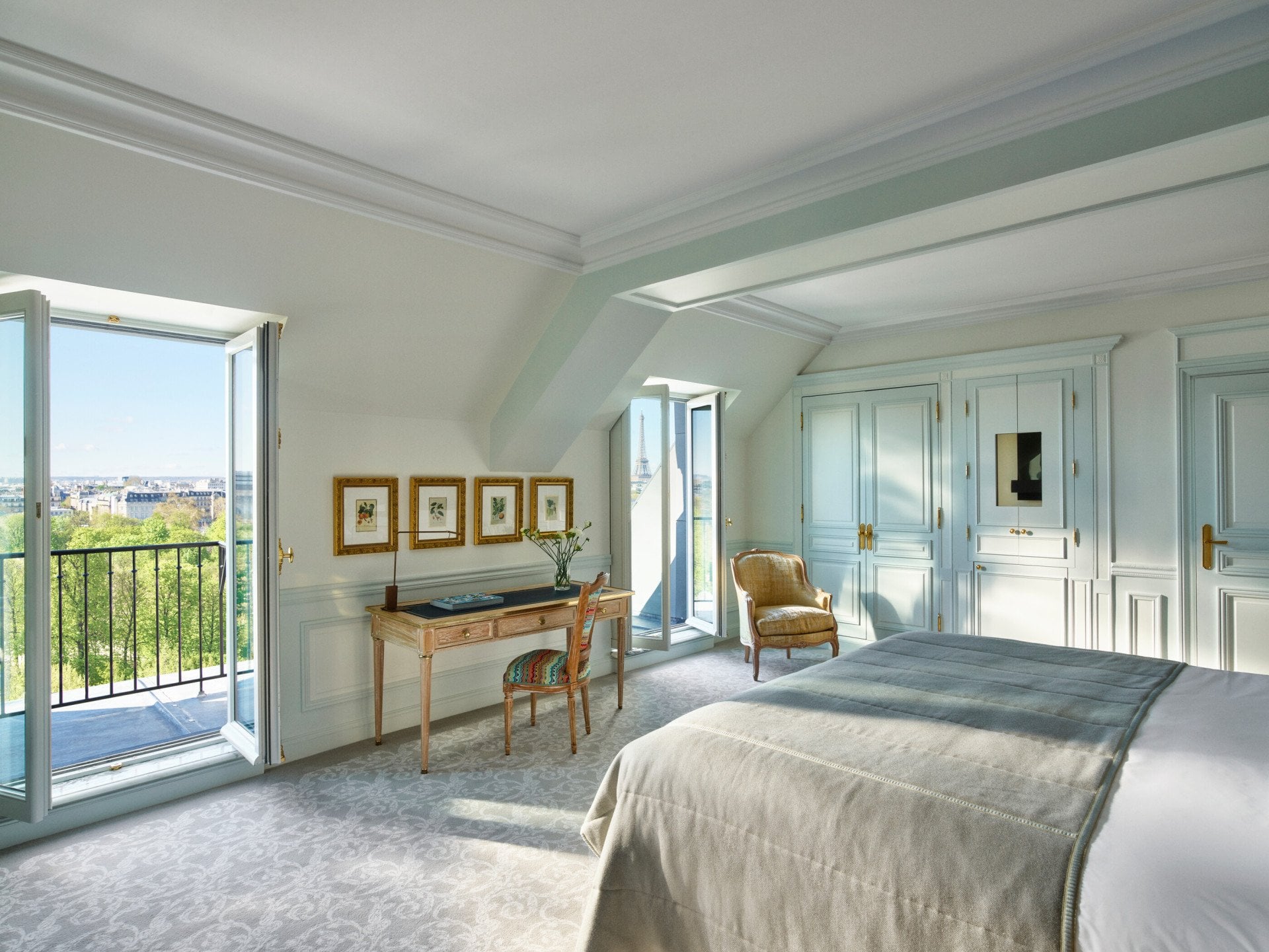 Designed by Lally & Berger, this beautifully bright room is located on the sixth floor. It features three Juliet balconies with stunning views of the Eiffel Tower and Place Vendôme, just steps from the hotel.
