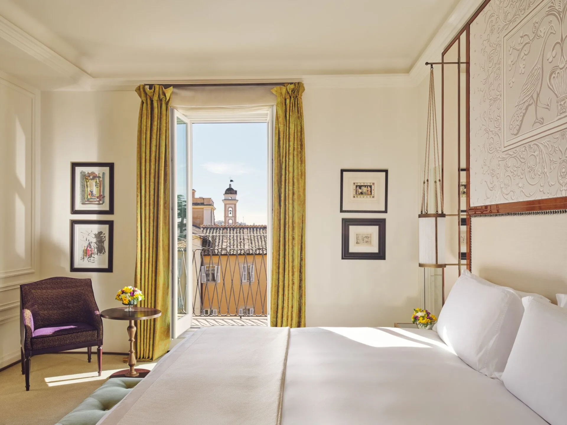 This one-of-a-kind rooftop suite's floor-to-ceiling windows provide glorious views over Rome. Inside, there's a study area, spacious living room and a dining area for up to eight people.